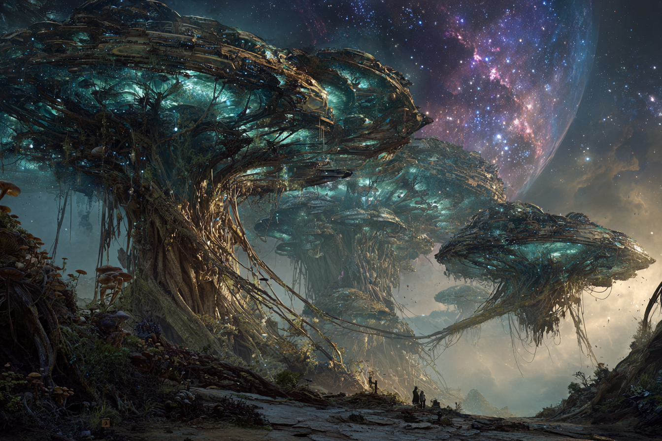 What if this isn't random chemistry? What if it's engineered outreach ... the fungi turning your autonomic rhythms into carrier waves for compressed archetypes? Visions unpack like zip files in your cortex: Images of lattice worlds where life thrives in harmony, insights on regenerating scorched earth. No words; just raw meaning. You emerge changed ... not buzzed, but enlightened. But here's the hook: What if they're listening back? Your thoughts ripple through the network, tweaking fungal genes in real-time, a two-way chat across species... and stars.